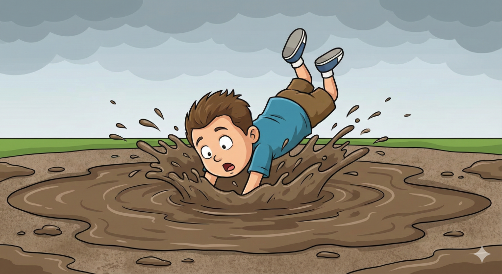 - Картинка: Уявіть, як хлопчик біг і падав прямо в глибоку калюжу.