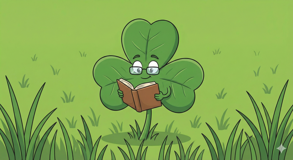 - Картинка: Уявіть собі звичайний клевер (квітку), який одягнув окуляри, читає книгу і виглядає дуже розумним.