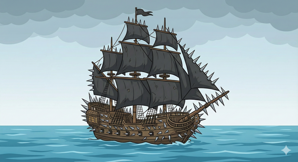 - Картинка: Величезний піратський корабель увесь вкритий гострими шипами, як їжак.