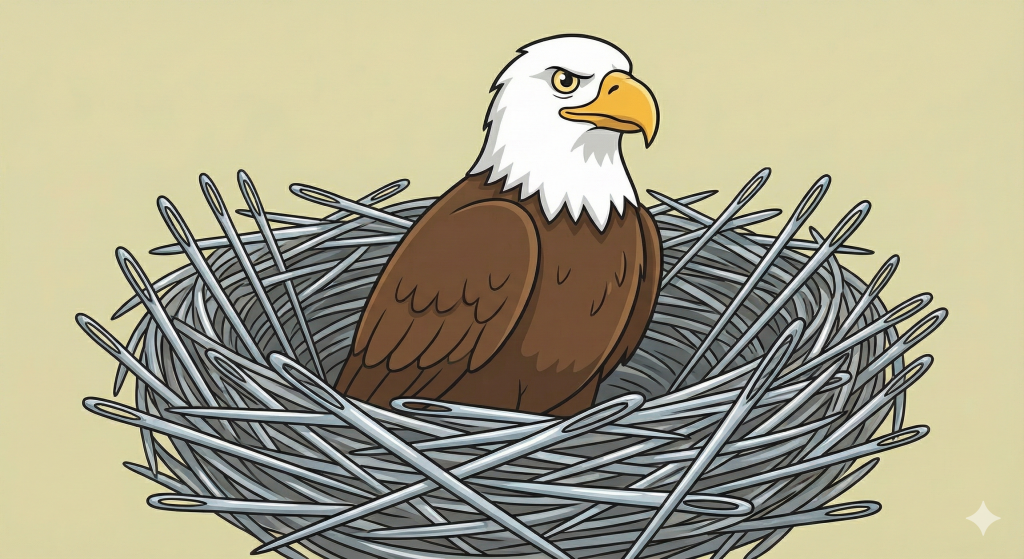- Картинка: Гордий орел сидить у гнізді, але воно зроблене не з гілок, а з гострих швейних голок.
