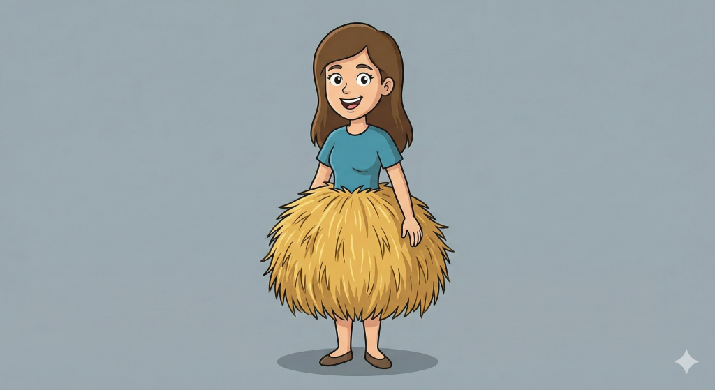 - Картинка: Дівчина одягла на себе не спідницю, а цілу скирту соломи.