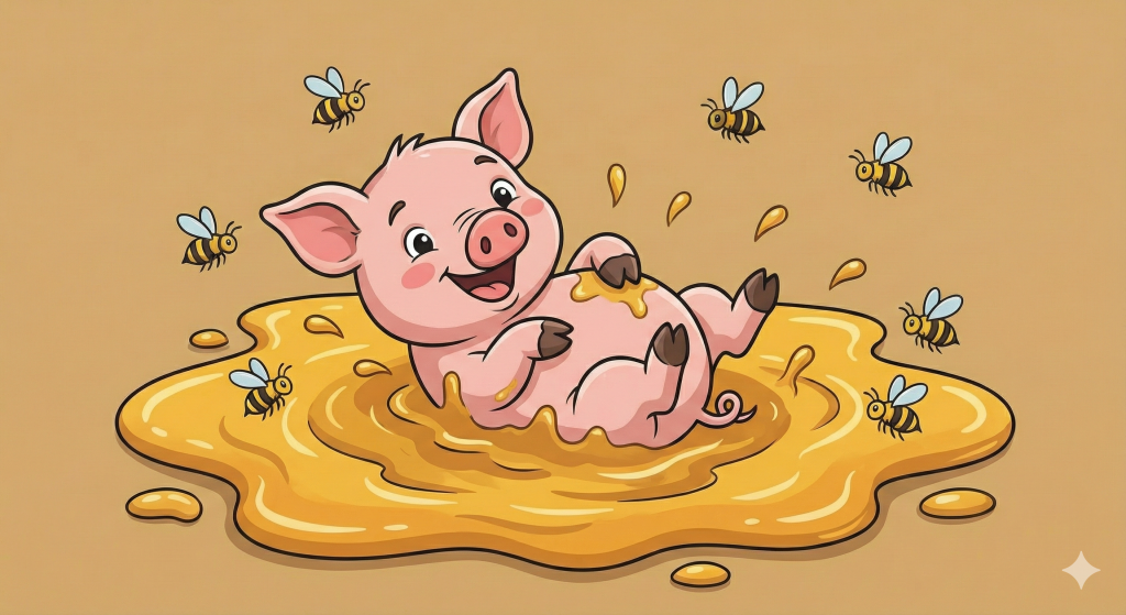 - Картинка: Свинка радісно валяється у багнюці, але коли ви підходите ближче, то бачите, що це солодкий липкий мед.